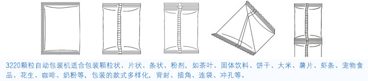 3220顆粒立式自動包裝機使用變頻調(diào)速器,關(guān)閉機器時自動打開封刀,節(jié)省材料,單片機控制系統(tǒng),故障率低,制袋,填充,計量,封口,印刷,成品輸送一次性完成。是衡水包裝機械顆粒包裝的熱銷機器。包裝款式圖如下:
