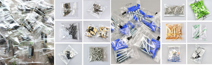 全自動五金件包裝機安裝有自動報警功能。少料、不規(guī)則螺絲卡料、空袋或者無料等供料異常時可自動檢測。設備自動停機(避免制作空袋,浪費材料)可以采用三邊封或背封式袋型,(我們建議采用背封式封口,這樣可以方便您的五金件下料,保證五金配件不在制袋器內卡料,做出來的袋子沒有死角,方便穩(wěn)定,到客戶手上也能方便打開使用)?呻S意設定多種袋長,以滿足不同數(shù)量物料包裝(降低耗材成本)可以在已有的震動盤中設置選擇性下料,ABCD四個不同品種順序包裝(專利產品)該設備封口部位及切刀部位安裝有安全保護裝置,以保證操作人員的人身安全。打開防護門即設備自動停機。