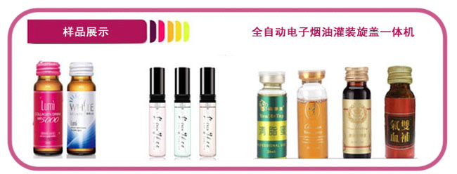 全自動電子煙油灌裝機(jī)--煙油灌裝加塞旋蓋機(jī)主要適用于50毫升以內(nèi)電子煙油、滴眼液、指甲油、眼影、精油等產(chǎn)品的自動灌裝、加塞和旋蓋。