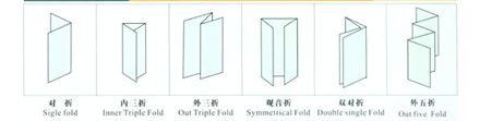 折紙樣式:對折、十字折、報表折、內三折、外三折、觀音折。如下圖所示: